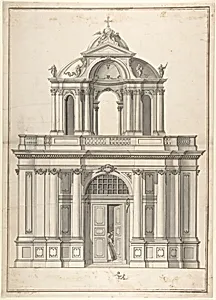 Pen and gray ink, brush and gray and black wash, brown ink framing lines
