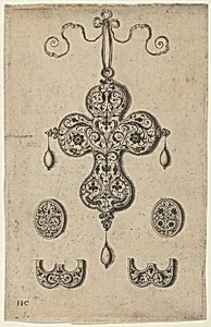 Design for the Verso of a Cross-Shaped Pendant Above a Pair of Oval Ornaments and Axe-Shaped Ornaments by Jan Collaert I|Hans Liefrinck