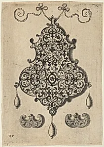 This delicate engraving, titled *Design for the Verso of a with an Oval Motif Strapwork*, dates to before 1573 and is to either Jan Collaert I or Hans Liefrinck, two prominent Northern European printmakers of the Renaissance era. Collaert, a Flemish artist from Antwerp, and Liefrinck, a Dutchaver, specialized in intricate ornamental designs that bridged art and craft. Produced as the first state of two (per the New Hollstein catalogue), this sheet measures just 5 9/16 × 3 7/8 inches, perfectly scaled for a jewelry pendant's reverse side. The work showcases engraving combined with blackwork—a ...