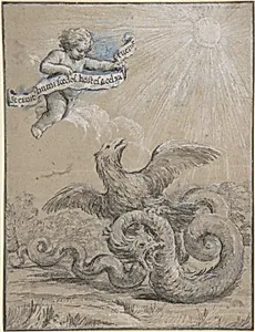Design with an Eagle Fighting with a Serpent and a Putto in the Sky Holding an Inscribed Banner.