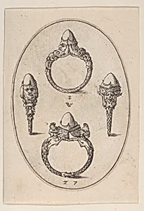 Step into the opulent world of 16-century French jewelry design with *Designs for Four Rings*, 27 from Pierre Woeiriot de Bouzey II's *Livre d'Aneaux d'Orfevrerie* (Book of Goldsmith's Rings), created in 1561 This delicate engraving, measuring just 2 11/16 × 1 7/8 inches on an oval plate, showcases Woeiriot's mastery in rendering intricate ring motifs—likely intended for goldsmiths crafting luxury adornments. The tiny scale mirrors the intimate size of wearable jewelry, capturing the Renaissance fascination with elaborate ornamentation inspired by classical antiquity and nature. As a leading ...