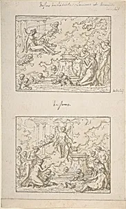 Pen and dark brown ink, brush and light brown wash, over black chalk, with framing lines around each design