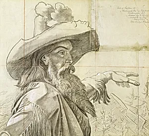 This captivating drawing, a *Detail of Cartoon for MuralWestward the Course of Empire..." by Emanuel Gottlieb Leut, offers a glimpse into the preparatory stages of one of America's iconic murals. Leutze, a-American Romantic painter best known for grand history paintings like *Washington Crossing the Delaware*, created this study as part of his full-scale cartoon—a traditional technique where artists outline compositions on paper before transferring them to walls. Housed in the Smithsonian American Art Museum, this captures a bust-length pioneer figure, complete with a distinctive hat, evoking ...