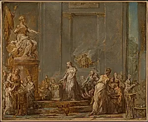 In the evocative *Dido's Sacrifice to* (ca. 1772–74), French artists Jean Bernard Restout, Joseph Marie, and Jean-Baptiste Marie collaborate on a mythological scene from Virgil's *Aeneid*. Dido of Carthage, desperate to sway the goddess Juno against Aeneas's departure, performs a ritual sacrifice. Rendered at modest dimensions (12 5/8 x 15 3/8 in.), this work captures the drama of classical antiquity through elegant female figures, emphasizing themes of devotion, power, and feminine agency—evident in the tags highlighting women and Juno. This piece exemplifies late 18th-century French draftsm...