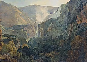 Mit seinen 165 Metern ist die Cascata delle Marmore (deutsch: „Marmorfall”) einer der höchsten Wasserfälle Italiens und zugleich der höchste, der je von Menschen geschaffen worden ist. Bereits die Römer leiteten den Fluss Velino um, der vorher weiter südlich in Sümpfe gemündet war und sich seitdem über mehrere Stufen in die Nera ergießt. Die Umgebung des Wasserfalls erscheint in Nerlys Bild wild zerklüftet. Der Blick fällt vom verschatteten Vordergrund steil herab, verliert sich in unwirtlichem ...