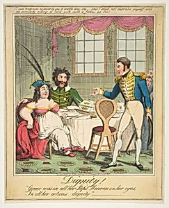 In the bustling world of Regency-era London, *Dignity! - "Grace was in all Steps. Heaven in her, In all her actions"* captures a moment of social commentary through the lens of British caricaturist Theodore Lane, with publishing by George Humphrey. Created on June 21, 1821, this hand etching draws from Alexander Pope's 1717 elegy, evoking ideals of feminine grace and poise amid the era's satirical prints that poked fun at manners and gender roles. Featuring men and women, reflects the vibrant culture of early 19th-century Britain, where such affordable artworks entertained the middle class. T...