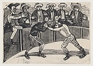 Don Chepito witnessing a boxing match between two men (one black, the other white)