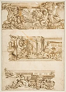 Created around 1747 by Venetian artist and engraver Antonio Maria Visini (1688–1782), this drawing served as a preparatory study for an engraving in theRaccolta di Variizzi* (Collection of Various Sketches), a Venetian showcasing diverse designs. Visentini, renowned for meticulously reproducing architectural views and ornaments by contemporaries like Canaletto, here worked after Angelo Rosis, intricate ornamental and architectural motifs typical of 18th-century's Rococo elegance. Housed in the Metropolitan Museum of Art's and Prints department, it reflects the city's vibrant culture of printma...