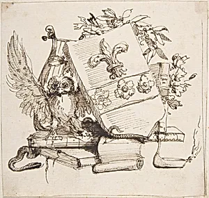 Drawing of a Decorated Coat of Arms surrounded by Books, Owl, Leaves, Vase and a Snake