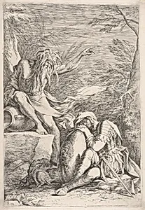 Dream of Aeneas, Aeneas rests on his shield, while the river god Tiber points upward