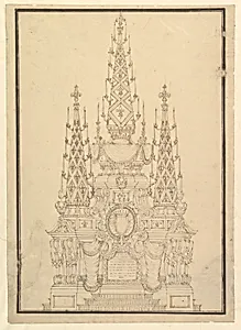Elevation of a Catafalque, Three Obelisks with Fluer-de-lys and Candles, Dated on Plaque at Bottom 1733.
