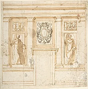 Elevation of a wall with partial pilasters, reliefs, and niche figures