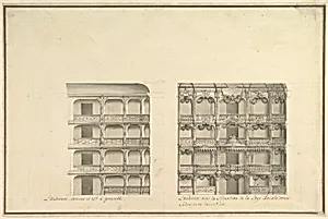 Giuseppe Galli Bibiena *Elevation of Boxes and Royal as Presently Constituted and to New Design* (. 1750) offers a fascinating glimpse into the opulent world of 18th-century theater architecture. This intricate drawing presents side-by-side elevations of theater boxes—contrasting the existing layout with a proposed redesign, highlighted by colorful garlands adorning the royal box. during the Baroque era's twilight, when grand opera houses symbolized royal splendor, it reflects Bibiena's expertise in scenography, a family legacy spanning generations of Italian architect-designers renowned for t...