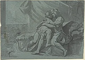 pen and black ink with gray wash, black chalk and white heightening on blue laid paper