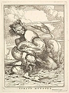 John Hamilton Mortimer (17401779), a British celebrated for his dramatic and imaginative drawings and prints, produced *Enrag'd Monster* as an etching dated December , 1778. This compact plate (9 1/8 x 6 5/8 in.) depicts a snarling, fantastical beast, embodying the era's fascination with the grotesque and sublime. Mortimer, influenced by Gothic sensibilities amid the Enlightenment, often explored monstrous forms that blurred the line between horror and high art, making this work a prime example of his bold, expressive style. Etching, Mortimer's favored medium here, involved coating a metal pl...
