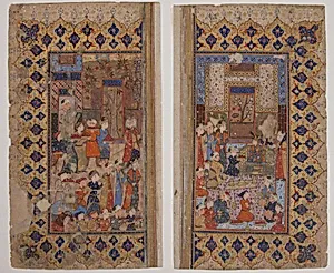 This exquisite folio, titled *Enthronement of Young Prince (Shapur?)*, comes from an illustrated manuscript of Maulana Nur al-Din `Abd al-Rahman Jami's renowned Persian poem *Yusuf and Zulaikha*, created in the second half of 16th century during the Safavid era in Persia. Jami's 15th-century romantic epic retells the Qur'anic story of Yusuf (Joseph) and his trials, often blending spiritual allegory with tales of power and beauty. Here, the scene captures a ceremonial enthronement of a youthful prince—possibly evoking the Sassanian ruler Shapur II—surrounded by attendants in a moment of regal s...