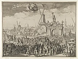 Entrance of William III into The Hague (Inhaling van S.K. Maj. aende Westeynder brug door de E.A. Magistraet van s'Gravenhage / Reception de sa Majesté au pont du Westende) from Bidloo, Inkomste van Koning Willem III