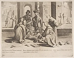 This etching, part of a series illustrating *The Life of Saint Bernardino of Siena*, captures three miraculous episodes from the saint's legendary ministry: curing a diseased young man in Rome (Episode 25), healing a leper (Episode 26), and warning an errant youth in Perugia (Episode 27). Created between 1610 and 1639 by Sienese artists Bernardino Capitelli and Rutilio Manetti, it reflects the Baroque era's dramatic flair, with dynamic compositions emphasizing the saint's divine power and moral authority. Saint Bernardino of Siena (1380–1444), a fervent Franciscan preacher, was renowned for h...
