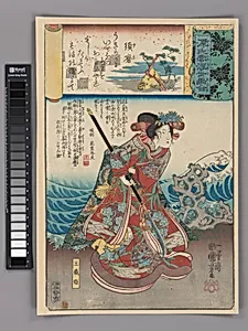 Step into the vibrant world of Edo-period Japan with Utagawa Kuniyoshi captivating woodblock print, *“Exile to Suma” (Suma): Tamaori-hime from his series *Scenes amid Genji Clouds Mat with Ukiyo-e* (ca. 1845–61). This ōban nishiki-e—meaning "brocade picture" for its lavish multicolored inks on paper—depicts Tamaori-hime a poignant figure from *The Tale of Genji*, the world's first novel by Murasaki Shikibu (early 11th century). In this exile scene at Suma Bay, Kuniyoshi reimagines the literary heroine amid dramatic clouds, blending classical narrative with the playful ukiyo-e ("pictures of the...