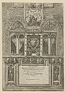 Façade of the Palazzo del Senato in Bologna with the Papal arms at center, with temporary decorations for the entry of Pope Clement VIII in Bologna in 1598