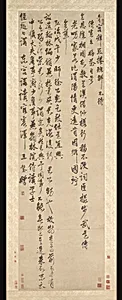 Wang Ao's *Farewell Poem* (贈別詩 ), dated 1498, is a masterful hanging scroll of ink calligraphy on paper, exemplifying the refined artistry of China's Ming dynasty (1368–1644). As a prominent scholar-official, Wang Ao crafted this poignant work, blending poetry and brushwork to convey sentiments of parting. The large-scale format—over 10 feet tall—invites viewers to unroll and immerse themselves in its rhythmic lines, a traditional Chinese practice for appreciating literati art in scholarly gatherings or private studios. Ming calligraphy like this revered the written word as a path to moral an...