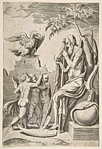 Father Time at the right leaning on a scythe, three naked boys and eagle at the left