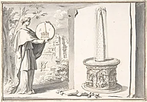 Female Figure Holding a Coin and Image of a Fountain