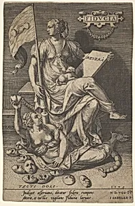 Fiducia, a seated woman holds a book and banner while turning her head away from a bare-breasted woman, who lies at her feet before an assemblage of masks on the ground, from the series 'Virtues conquering vices' after Maerten de Vos