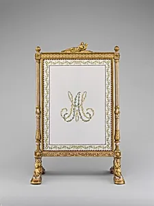 Carved, painted and gilded walnut; modern cotton twill with silk embroidery