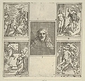 Five numbered scenes, each after a painter in the Accademia Degl'Incamminati, from IL FUNERALE D'AGOSTINO CARRACCIO FATTO IN BOLOGNA SUA PATRIA DAGL'INCAMINATI Academici del Disegno: 1. Painting and Poetry mourning the death of Agostino Carracci, painted by Francesco Brizio; 2. Painting with a lyre and Apollo pointing to stars on Carracci's grave, design by Giacomo Cavedone; 3. The head of Christ, painted by Agostino Carracci; 4. Prometheus with a torch and Athena behind him, painted by Alessandro Albini; 5. Aurora abducting Cephalus, painted by Leonello Spada.