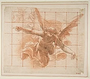Welcome to the Metropolitan Museum of Art's Drawings and Prints collection, where Cristoforo Roncalli, known as Pomarancio (1553–1626), captivates with his *Flying Angel*. This intimate drawing, gifted by Joseph M. Lichtenauer in 1890, measures just 6 15/16 x 8 1/2 inches, yet bursts with dynamic energy. Roncalli, a prominent Italian Mannerist painter active in late 16th-century Rome, specialized in frescoes for churches and palaces, blending Renaissance grace with elongated forms and dramatic movement characteristic of Mannerism. Crafted in red chalk with subtle black chalk accents and squar...