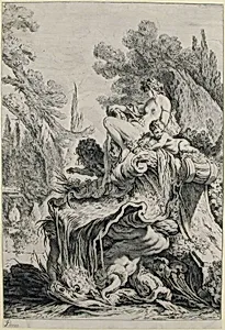 Jean-Baptiste Marie Pierre's *Fountain with aad Seated on a* (ca. 1740) is a delicate etching that captures the whimsical elegance of 18th-century Rococo art. The composition features a mythological naiad—a water nymph—gracefully perched on a large shell, surrounded by playful children and cascading water motifs. Rendered on a sheet measuring 14 13/16 x 10 1/16 inches, this print evokes the ornate garden fountains popular in Versailles-era landscapes, blending fantasy with natural beauty. Pierre, a prominent French engraver and painter who later directed the Académie de France in Rome, excell...