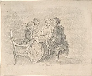 In the intimate graphite drawing *Four Ladies Sitting around a Table Occupied with Needlework, Reading, and Writing* (1758), Daniel Nikolaus Chodowiecki captures serene moment of domestic life among middle-class women. Created when the artist was just 20, this small-scale work (4 3/4 x 1 15/16 in.) showcases four figures gathered at a table, absorbed in needlework, reading, and writing—activities that highlight the refined leisure and education of 18th-century European women. The verso features a quick study of a woman with needlework, revealing Chodowiecki's preparatory process. Chodowiecki, a leading German Rococo artist and illustrator active in Berlin, excelled in genre scenes that depicted everyday morality and social customs during the Enlightenment. His precise graphite technique—using fine lines and subtle shading—brings a lifelike intimacy to these vignettes, making them feel like glimpses into real homes. Such drawings often served as studies for his popular prints, disseminating bourgeois ideals of virtue, literacy, and domestic harmony across Europe. Today, housed in the Metropolitan Museum of Art's Drawings and Prints department (Purchase, C. G. Boerner Gift, 2006), this double-sided gem offers a window into gender roles and cultural aspirations of the era, reminding us how art preserved the quiet rhythms of daily life.