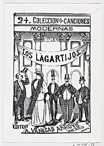 Four men and one woman in fine clothes standing in a line under a banner, illustration for 'Los Lagartijos (The Dandies)'