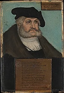 This intimate portrait depicts Friedrich III, Elector of Saxony (146–1525), known "the Wise," a pivotal figure in early German history. Painted posthumously in 1533 by Cranach the Elder and workshop, it captures the elector's dignified presence with characteristic Renaissance precision. Cranach, a leading artist of the German Renaissance and close to the Saxon court, specialized in such regal portraits, often produced in series by his prolific workshop to commemorate patrons. Friedrich's legacy endures as a protector of the Protestant Reformation; he shielded Martin Luther from imperial persecution after the 1521 Diet of Worms, enabling the spread of Lutheran ideas. This small-scale work (just 8 x 5⅝ inches) on beech wood, enhanced by letterpress-printed paper labels identifying the sitter, reflects the era's innovative blending of painting and printmaking for authentication and dissemination. The oil medium allows Cranach's masterful rendering of textures—like the luxurious fur collar and intricate chain—highlighting status and piety. Housed in the Metropolitan Museum of Art (gift of Robert Lehman, 1946), this gem exemplifies how Renaissance portraits served as political tools, immortalizing rulers in an age of religious upheaval.