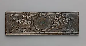 This exquisite front panel from a writing box, crafted by Severo Calzetta Ravenna in the 16 century, exemplifies the Renaissance fascination with classical mythology. Severo, a master bronzist active in Ferrara and Venice, in small-scale plaquettes—relief plaques prized by collectors for their portability and refined detail. Cast in copper alloy, this 6.5 x 20.5 cm panel depicts dynamic scenes of centaurs nymphs, evoking wild revelry of ancient Greek tales where half-human creatures pursue ethereal forest spirits. The artwork's warm brown patina, accented by worn black areas, reveals centurie...