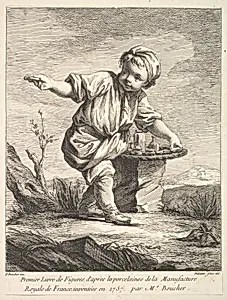 Frontispiece with litte boy holding a basket, from Premier Livre de Figures d'après les porcelaines de la Manufacture Royale de France, inventées en 1757, par Mr. Boucher (First Book of Figures after porcelains from the Manufacture Royale de France, devised in 1757, by Mr. Boucher)
