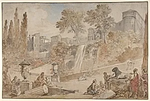Pen and brown ink, brush and brown and gray wash, watercolor, heightened with white, over black and red chalk