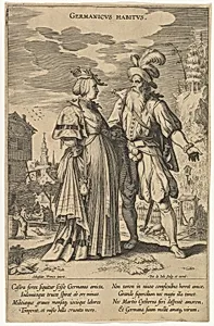 "Germanicus Habitus"German Attire), from the series *Fashions of Different*, offers a captivating glimpse into 17th-century perceptions of European dress. This engraving depicts men and women in traditional German costumes, showcasing the elaborate ruffs, doublets, and flowing skirts that defined regional styles. Produced as part of a popular genre of costume books, it served both as fashion documentation and entertainment, allowing viewers to vicariously explore "exotic" national habits from afar. Engraved by Flemish master Pieter de Jode I after designs by Sebastiaen Vrancx, this first-stat...