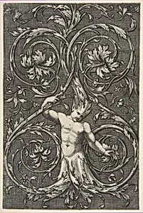 Grotesque with male figure with lower body and head of acanthus scrolls