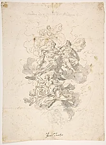 Francesco Solimena (1657–1747), a Neapolitan Baroque artist, masterfully captured dynamic energy in this preparatory sketch titled *Group of Allegorical Figures: Sketch for a Ceiling Decoration*. Likely designed for one of the grand frescoed vaults that adorned 18th-century Italian palaces and churches, it features intertwined male and female figures symbolizing virtues, triumphs, or divine themes—hallmarks of Baroque allegory. Solimena's theatrical compositions, influenced by the dramatic flair of predecessors like Luca Giordano, emphasized movement and illusion to draw viewers' eyes upward i...