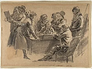 Step into the vibrant world of late 18th-century Paris with Louis Léopold Boilly's *Group of Artists in Jean Isabey's Studio*ca. 1798). This lively drawing captures a gathering of men and women artists in the studio of Jean-Baptiste Isabey, celebrated miniaturist, during the turbulent post-Revolutionary Directory period.illy, a master of intimate genre scenes, skillfully portrays the camaraderie and creative energy of this bohemian circle, reflecting the democratization of art in a France rebuilding after upheaval. Rendered in Conté crayon—a revolutionary medium invented in 1795 amid wartime ...