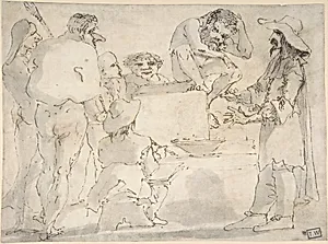 This lively drawing, *Group of Caricatured with an Artist Drawing*, a whimsical scene of exaggerated male figures, including an artist at work, rendered with spirited energy. Attributed to Pier Francesco Mola or the influential Bolognese master Guercino (Giovanni Francescoieri, 1591–1666), it dates to the mid-17th century. Created with pen and brown ink heightened by brush and gray wash paper (7 11/16 x 10 3/8 in.), the technique showcases the artists' mastery of fluid lines for comic distortion and subtle wash for depth and shadow, evoking the theatrical flair of the Baroque era. Guercino, a...