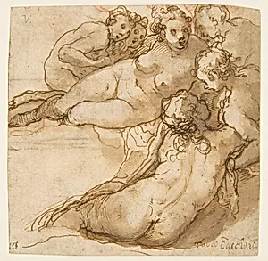 Group of Six Reclining Nude Women (Nymphs Bathing) (recto); Sketch of a Leg (verso)