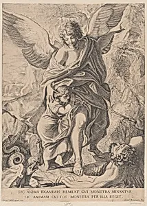 Guardian angel leading a child through danger, with a snake at lower left and a demon at lower right