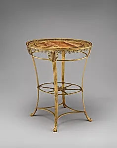 This elegant *Guéridon* by the Berlin firm Werner & Mieth, dating to around 1810, is a masterful example of early 19th-century German arts. Standing 29 inches tall with a 23¼ × 19¼-inch footprint, it combines shimmering gilt yellow metal—likely bronze—with a smooth alabaster top, creating a luxurious pedestal table ideal for displaying fine objects or serving delicacies. Housed in the Metropolitan Museum of Art's Department of European Sculpture and Decorative Arts, it reflects the opulence of Prussian elite interiors. Crafted during Berlin's Neoclassical flowering, influenced by ancient Grec...