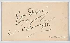 Step into the world of 19th-century etiquette with this charming engraving, a calling card for the renowned French artist Gustave Dor (1832–1883). Produced sometime between circa 1849 and 1883—spanning much of Doré's illustrious career—this petite print (just 2 3/8 × 4 inches) exemplifies ephemera from the Drawings and Prints department at The Metropolitan Museum of Art. Calling cards were essential accessories for the elite, left during visits to announce one's arrival or request an audience, much like a modern business card but infused with Victorian flair. Though the artist is listed as anonymous (likely the engraver), it features Doré, a master of Romantic illustration celebrated for his dramatic biblical scenes, Dante's *Inferno*, and works like *Don Quixote*. Engraving, the medium here, involved incising intricate lines into a metal plate for inked impressions, allowing crisp, reproducible portraits ideal for such personal items. The tag "Playing Cards" hints at its card-like format, evoking playful yet refined 19th-century whimsy. A gift to the Met in 1977 from F. C. Schang, this artifact offers a glimpse into Doré's personal life amid his fame, blending artistry with everyday culture. It reminds us how even geniuses navigated society's intricate rituals.