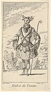 Habit de Faune: a faun wearing a tonnelet with a flute attached, a cane in his right hand and vines around his horns, from 'New designs for costumes' (Nouveaux desseins d'habillements à l'usage des balets operas et comedies)