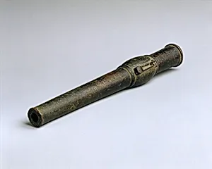 Step into the riveting world of early firearms with this *Hand Cannon (Chong)*, a bronze masterpiece dated 1424 from Ming Dynasty China. Measuring just 14 inches long and weighing over 5 pounds, this portable weapon was designed for handheld use, bridging the gap between ancient fire lances and modern guns. Its .59-inch caliber made it a formidable tool on the battlefield, reflecting China's pioneering role in gunpowder technology since the 9th century. Crafted in bronze—a durable alloy prized for its casting properties—this cannon exemplifies advanced Chinese metallurgy. The smooth bore and ...