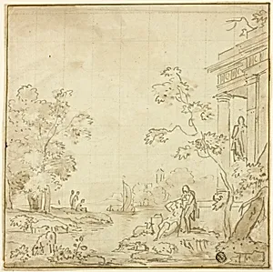 Pen and brown ink with brush and brown wash, over traces of graphite, squared in black chalk, on ivory laid paper